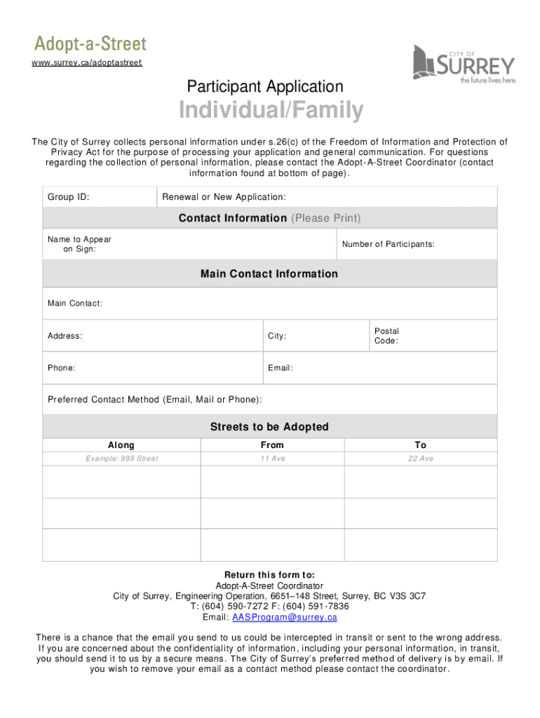 AdoptaStreetR e.g. i s t r at i o n pa c k a g e Individuals & Families swww.surrey.ca/adoptastreetParticipant ApplicationIndividual/Family The City of Surrey collects personal information under s.26(c)