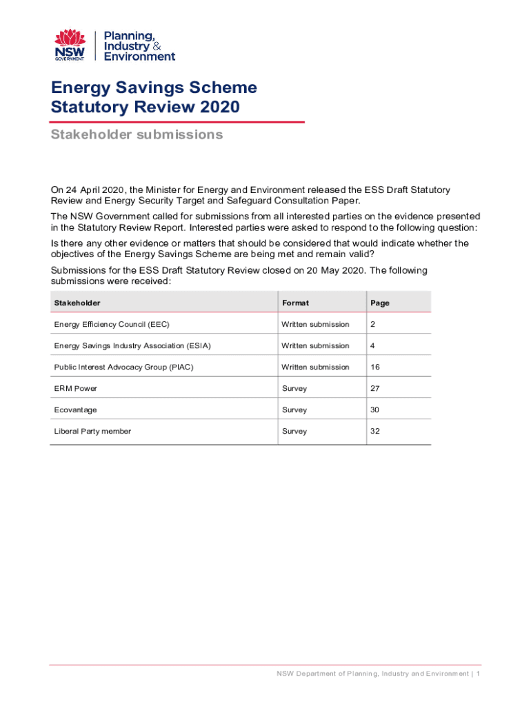 Energy Savings Scheme Statutory Review 2020 Stakeholder submissions 24 April 2020, the Minister for Energy and Environment released the ESS Draft Statutory Review and Energy Security Target and Safeguard