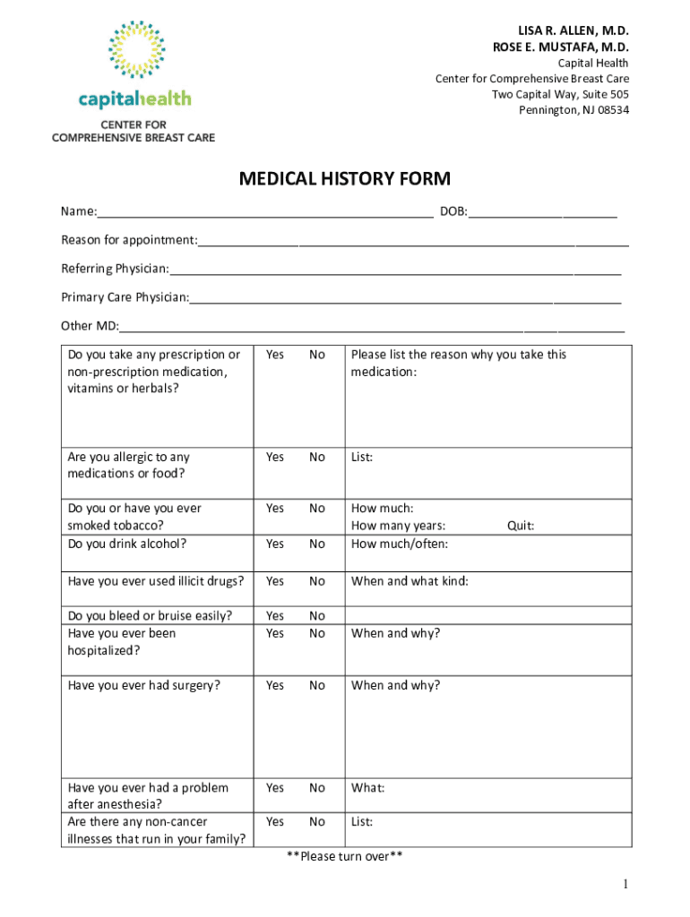 LISA R. ALLEN, M.D. ROSE E. MUSTAFA, M.D. Capital Health Center for Comprehensive Breast Care Two Capital Way, Suite 505 Pennington, NJ 08534MEDICAL HISTORY FORM Name:___ DOB:___ Reason for appointment:___