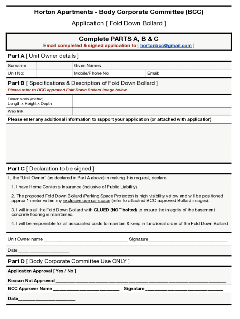 Horton Apartments Body Corporate Committee (BCC) Application [Fold Down Bollard]Complete PARTS A, B & C Email completed & signed application to [hortonbcc@gmail.com]Part A [Unit Owner details] Surname:Given