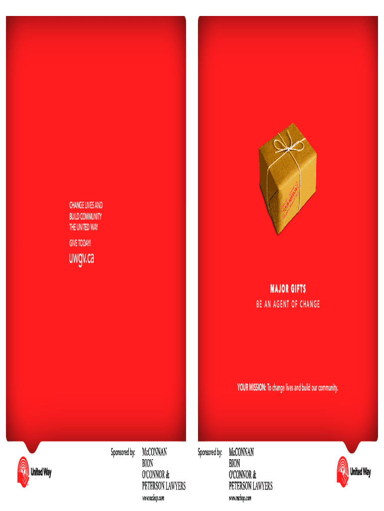 CHANGE LIVES AND BUILD COMMUNITY THE UNITED WAY GIVE TODAY!UV.ca MAJOR GIFTS BE AN AGENT OF CHANGEOVER MISSION: To change lives and build our community. Sponsored by:Sponsored by:LAWYERSLAWYERSWho