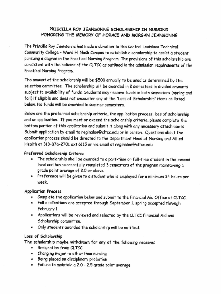 PRISCILLA ROY JEANNE SCHOLARSHIP IN NURSING HONORING THE MEMORY OF HORACE AND MORGAN JEANNE The Priscilla Roy Jeanne has made a donation to the Central Louisiana Technical Community College Ward H.