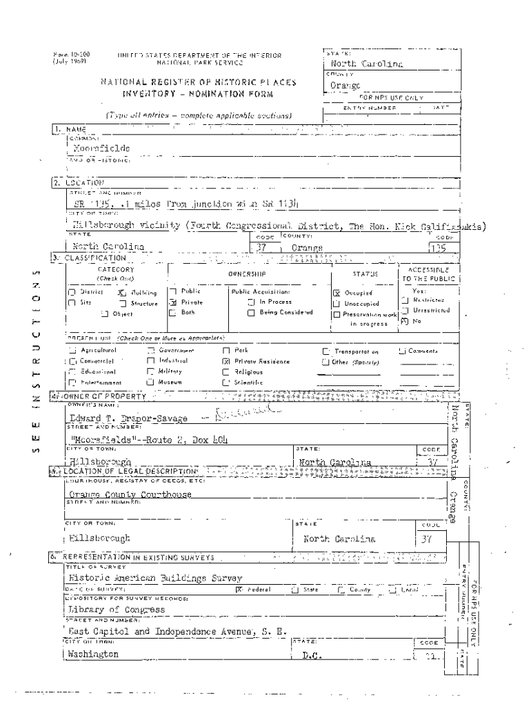 Form 10300 (July 1969)STATE:UNI T ED ST A T ES DE APARTMENT OF TH E INT PRIOR NA TINA L PARK SE RVI CE North \'CarolinaNATIONAL REGISTER OF HISTORIC PLACES INVENTORY NOMINATION FORM Orange FOR NPS