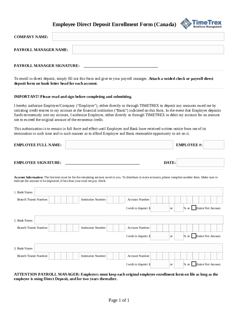 Employee Direct Deposit Enrollment Form (Canada) COMPANY NAME: PAYROLL MANAGER NAME:PAYROLL MANAGER SIGNATURE:___To enroll in direct deposit, simply fill out this form and give to your payroll manager.