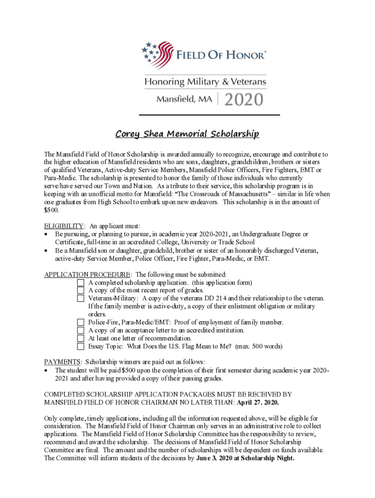 Corey Shea Memorial Scholarship The Mansfield Field of Honor Scholarship is awarded annually to recognize, encourage and contribute to the higher education of Mansfield residents who are sons, daughters,