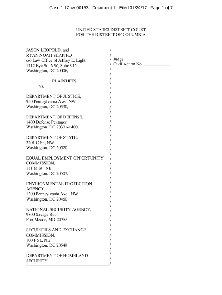Case 1:17cv00153 Document 1 Filed 01/24/17-Page 1 of 7UNITED STATES DISTRICT COURT FOR THE DISTRICT OF COLUMBIAJASON LEOPOLD, and RYAN NOAH SHAPIRO c/o Law Office of Jeffrey L. Light 1712 Eye St.,