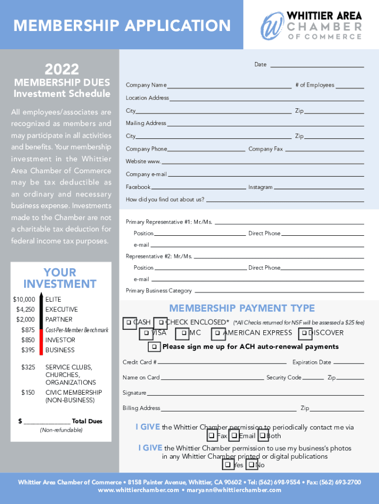 New chamber membership investment typically requires individuals or businesses to provide contact information, business details, and payment details.