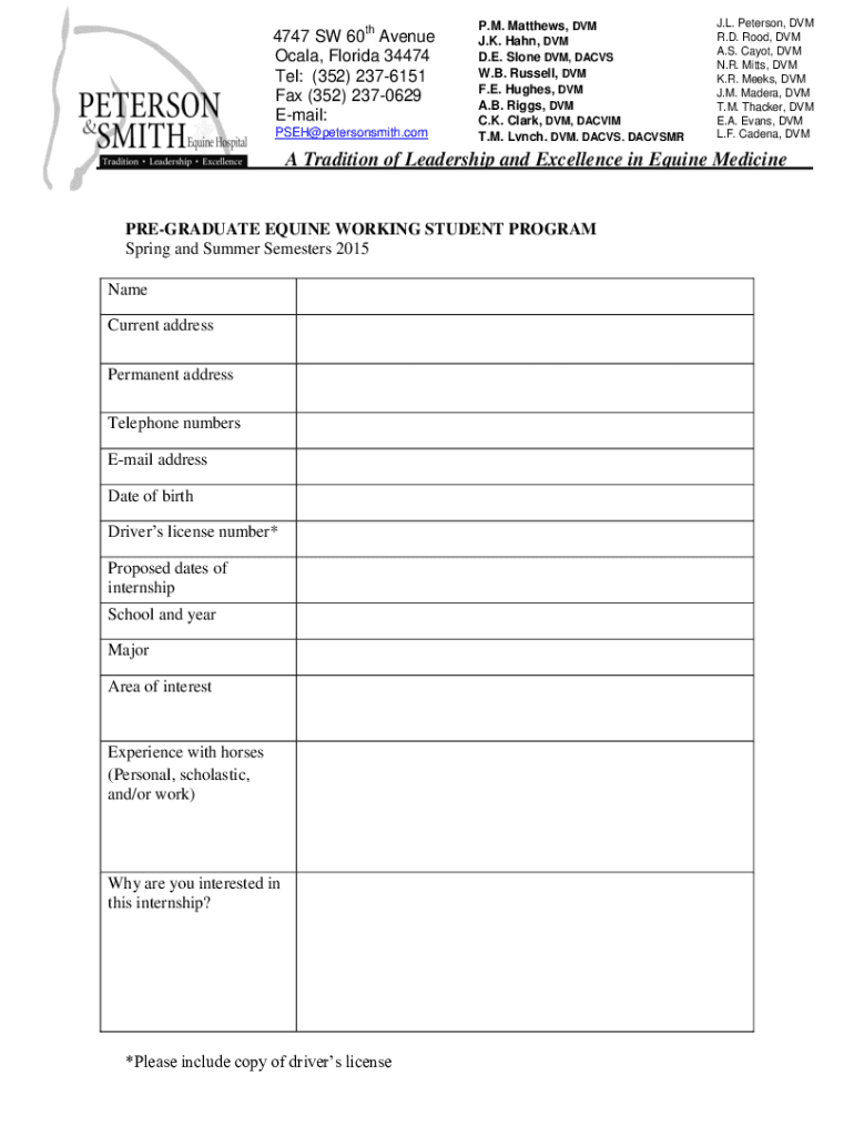 4747 SW 60th Avenue Ocala, Florida 34474 Tel: (352) 2376151 Fax (352) 2370629 Email: PSEH@petersonsmith.comP. M. Matthews, DVM J.K. Hahn, DVM D.E. Alone DVM, DACES W.B. Russell, DVM F.E. Hughes, DVM