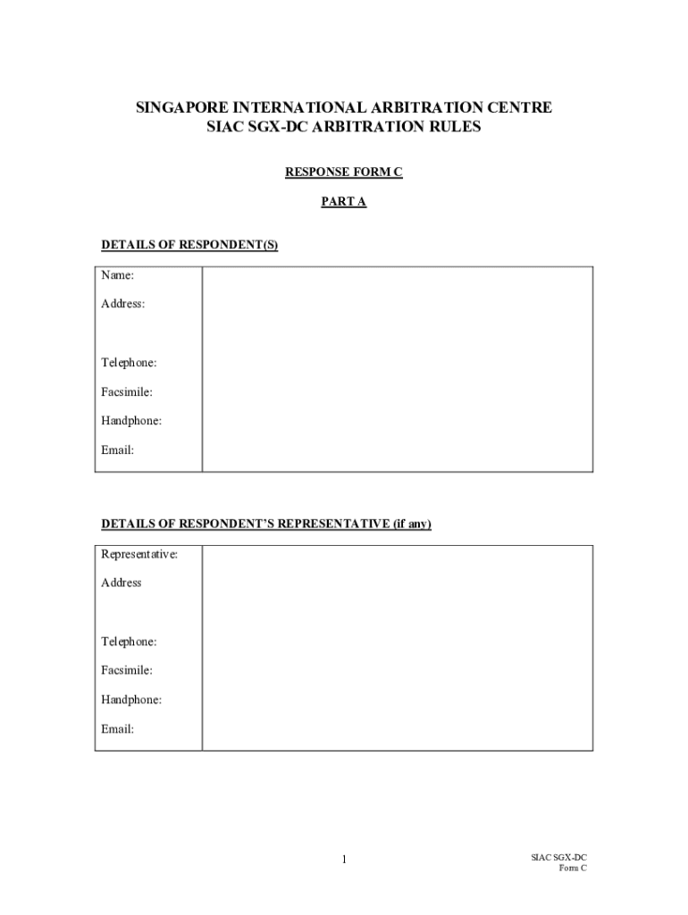 SINGAPORE INTERNATIONAL ARBITRATION Center SIAC SGX DC ARBITRATION RULES RESPONSE FORM C PART A DETAILS OF RESPONDENT(S) Name: Address:Telephone: Facsimile: Hand phone: Email:DETAILS OF RESPONDENTS
