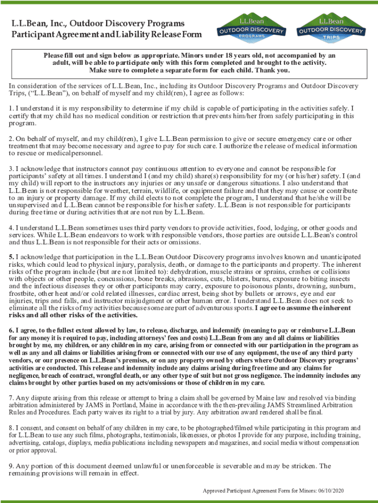 L.L. Bean, Inc., Outdoor Discovery Programs Participant Agreement and Liability Release Form Please fill out and sign below as appropriate. Minors under 18 years old, not accompanied by an adult,