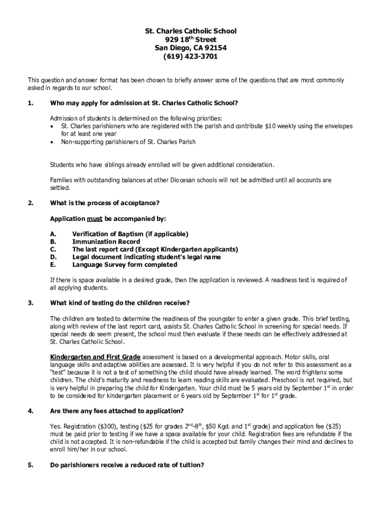 St. Charles Catholic School 929 18th Street San Diego, CA 92154 (619) 4233701 This question and answer format has been chosen to briefly answer some of the questions that are most commonly asked in