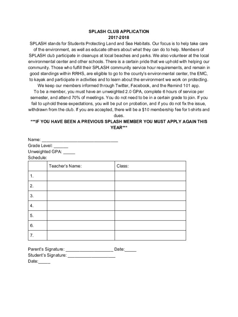 SPLASH CLUB APPLICATION 20172018 SPLASH stands for Students Protecting Land and Sea Habitats. Our focus is to help take care of the environment, as well as educate others about what they can do to