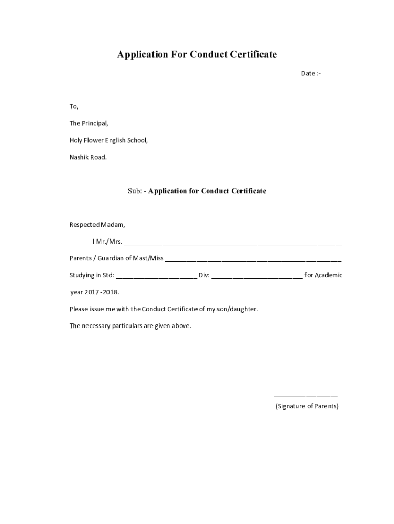 Application For Conduct Certificate Date :To, The Principal, Holy Flower English School, Nashik Road. Sub: Application for Conduct CertificateRespected Madam, I Mr./Mrs. ___ Parents / Guardian of