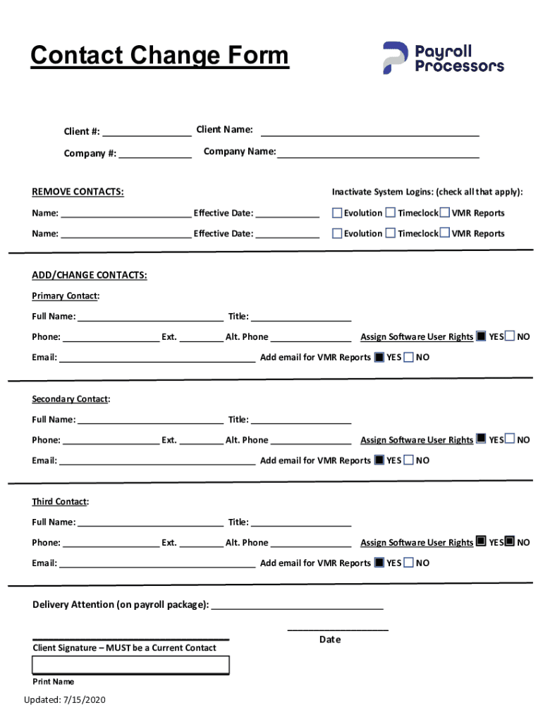 Contact Change Form Client Name:Client #:Company Name:Company #:REMOVE CONTACTS:Inactivate System Logins: (check all that apply):Name:Effective Date:EvolutionTimeclockVMR Reportage:Effective Date:EvolutionTimeclockVMR