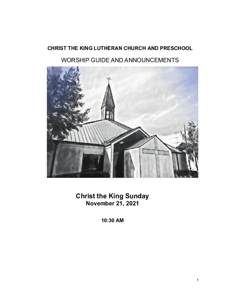 CHRIST THE KING LUTHERAN CHURCH AND PRESCHOOLWORSHIP GUIDE AND ANNOUNCEMENTS Christ the King Sunday, November 21, 2021 10:30 AM1CHRIST THE KING LUTHERAN CHURCH AND PRESCHOOL WORSHIP GUIDE AND ANNOUNCEMENTS