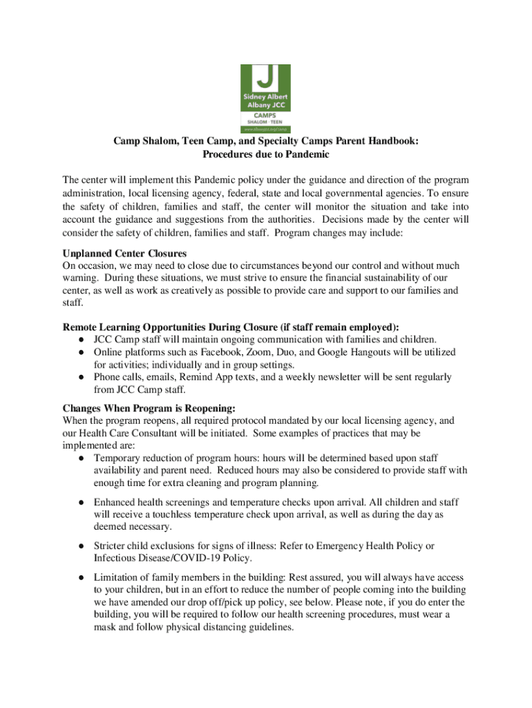 Camp Shalom, Teen Camp, and Specialty Camps Parent Handbook: Procedures due to Pandemic The center will implement this Pandemic policy under the guidance and direction of the program administration,