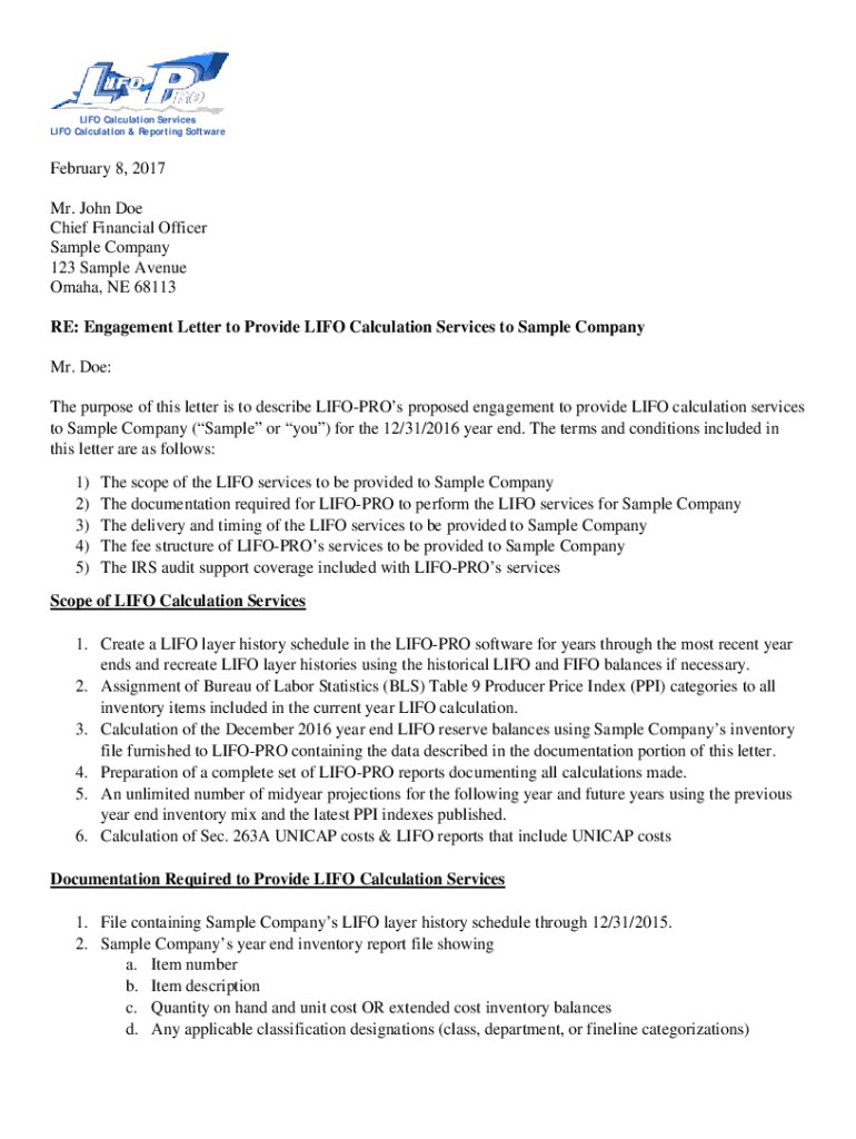 LIFO Calculation Services LIFO Calculation & Reporting Software February 8, 2017, Mr. John Doe Chief Financial Officer Sample Company 123 Sample Avenue Omaha, NE 68113 RE: Engagement Letter to Provide