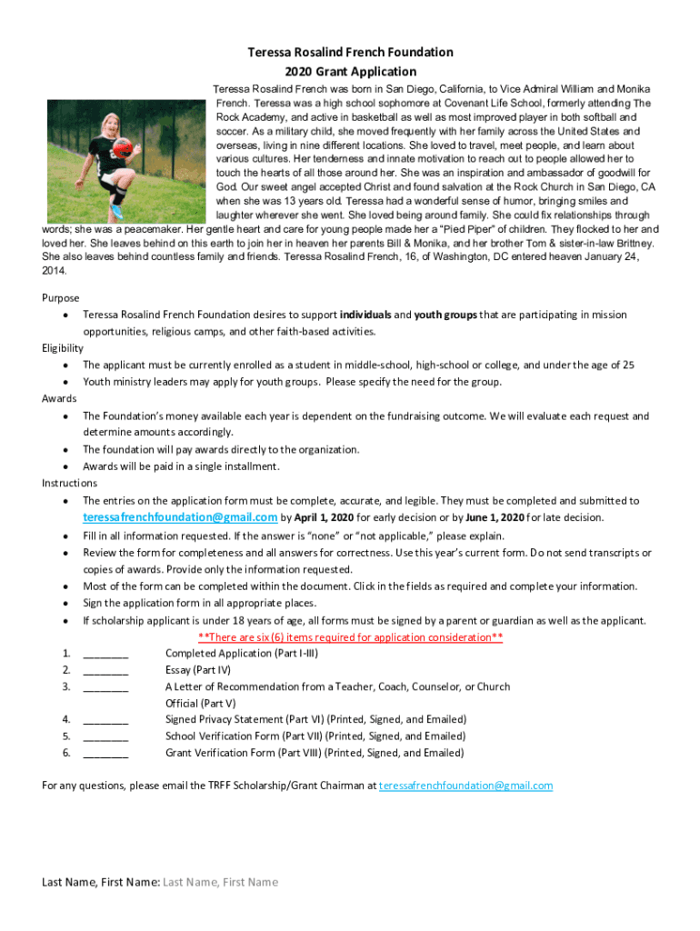 Teresa Rosalind French Foundation 2020 Grant Application Teresa Rosalind French was born in San Diego, California, to Vice Admiral William and Monika French. Teresa was a high school sophomore at
