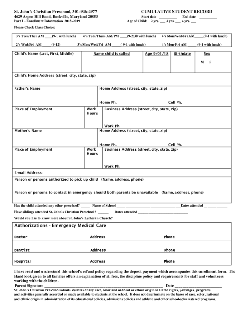 St. Johns Christian Preschool, 3019464977CUMULATIVE STUDENT RECORD4629 Aspen Hill Road, Rockville, Maryland 20853Start date ___ End date ___ Age of Child: 2 yrs. ___ 3 yrs. ___ 4 yrs. ___Part I Enrollment