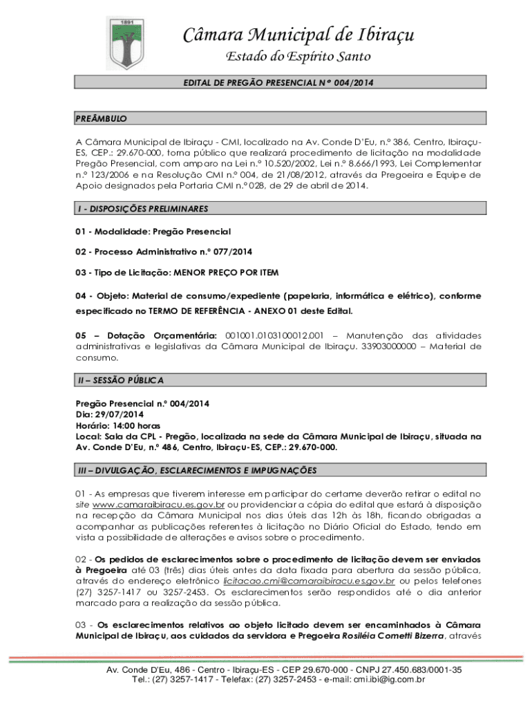 Clara Municipal de Ibirau Est ado do Esprit Santa EDIT AL DE PRESO PRESENCE N 004/2014PREMBULO A Clara Municipal de Ibirau CMI, localized Na Av. Code DEU, n. 386, CENTR, Brakes, CEP.: 29.670000, torn