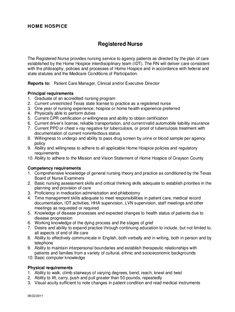 HOME HOSPICERegistered Nurse The Registered Nurse provides nursing service to agency patients as directed by the plan of care established by the Home Hospice interdisciplinary team (IDT). The RN will