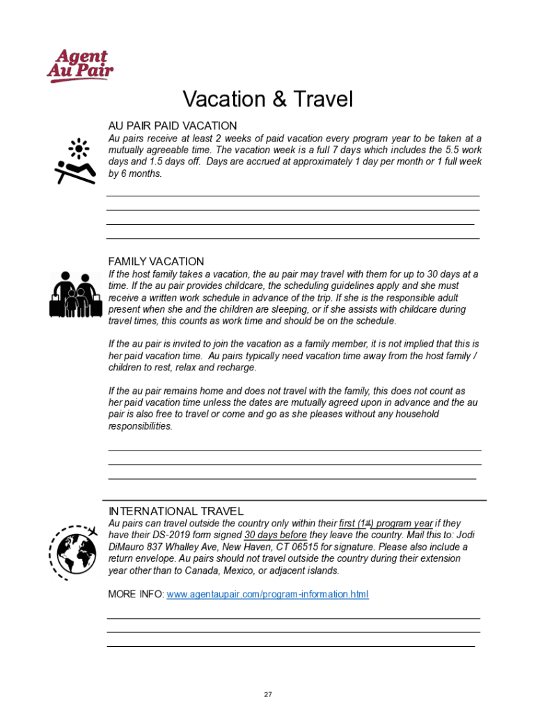 Vacation & Travel AU PAIR PAID VACATION Au pairs receive at least 2 weeks of paid vacation every program year to be taken at a mutually agreeable time. The vacation week is a full 7 days which includes