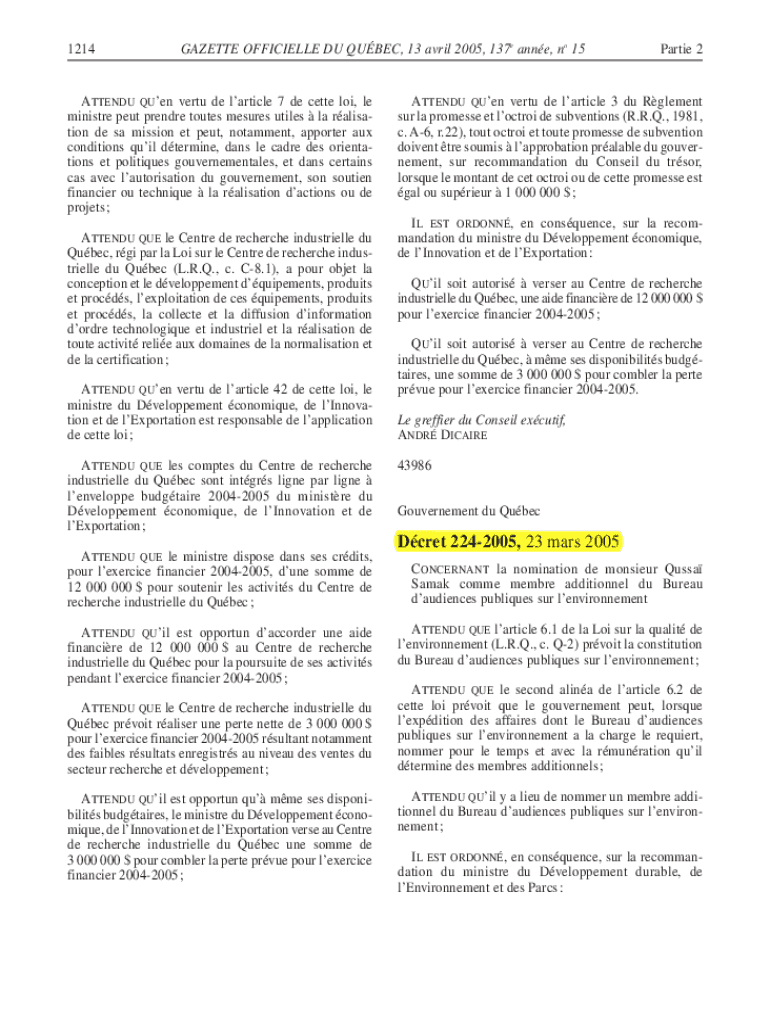 1214GAZETTE OFFICIALLY DU QUEBEC, 13 April 2005, 137e Anne, no 15ATTENDU Queen vert DE article 7 de Bette LOI, LE minister put prepare touts measures tiles la radiation de SA mission ET put, comment,