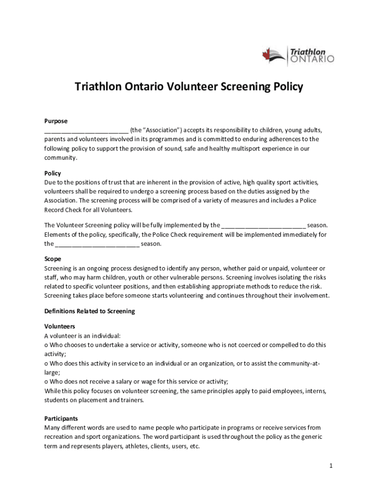 Triathlon Ontario Volunteer Screening Policy Purpose ___ (the Association) accepts its responsibility to children, young adults, parents and volunteers involved in its programs and is committed to