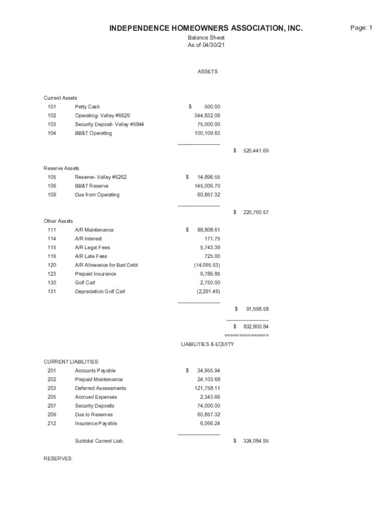 INDEPENDENCE HOMEOWNERS ASSOCIATION, INC. Balance Sheet As of 04/30/21ASSETSCurrent Assets 101Petty Cash102Operating Valley #6629103Security Deposit Valley #5844104BB&T Operating$500.00 344,832.06