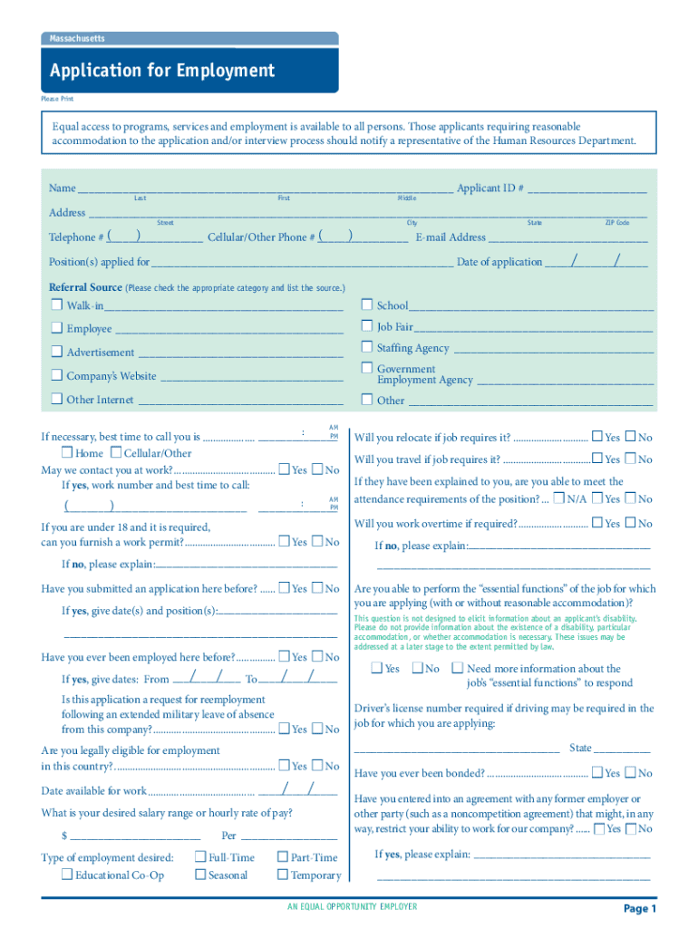MassachusettsApplication for Employment Please PrintEqual access to programs, services and employment is available to all persons. Those applicants requiring reasonable accommodation to the application