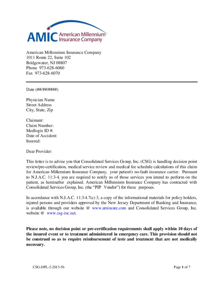 American Millennium Insurance Company 1011 Route 22, Suite 102 Bridgewater, NJ 08807 Phone 9736286060 Fax 9736286070Date (##/##/####) Physician Name Street Address City, State, Zip Claimant: Claim