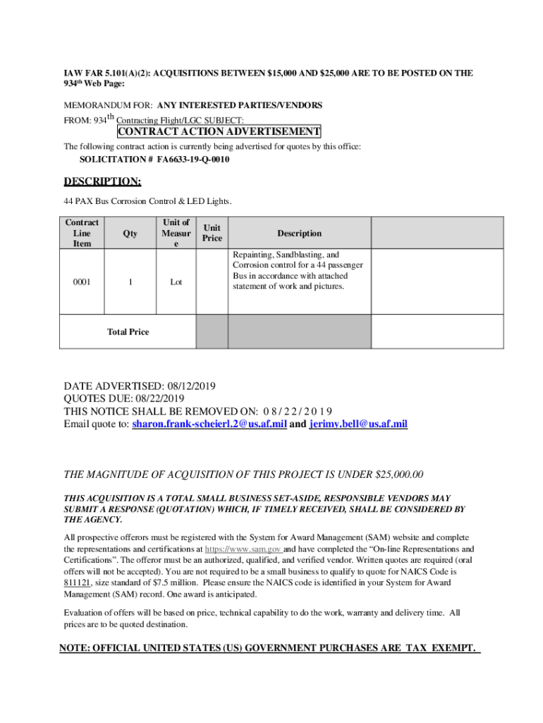 LAW FAR 5.101(A)(2): ACQUISITIONS BETWEEN $15,000 AND $25,000 ARE TO BE POSTED ON THE 934th Web Page: MEMORANDUM FOR: ANY INTERESTED PARTIES/VENDORS FROM: 934th Contracting Flight/LGC SUBJECT:CONTRACT