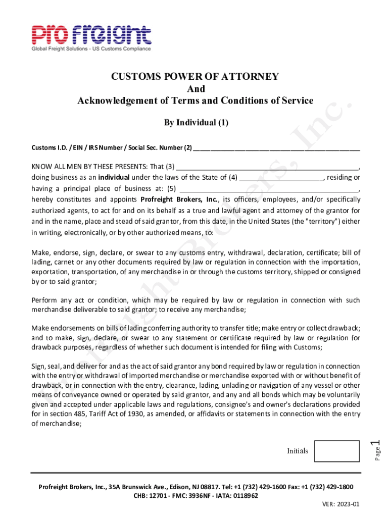 CUSTOMS POWER OF ATTORNEY And Acknowledgement of Terms and Conditions of Service By Individual (1) Customs I.D. / EIN / IRS Number / Social Sec. Number (2) ___KNOW ALL MEN BY THESE PRESENTS: That