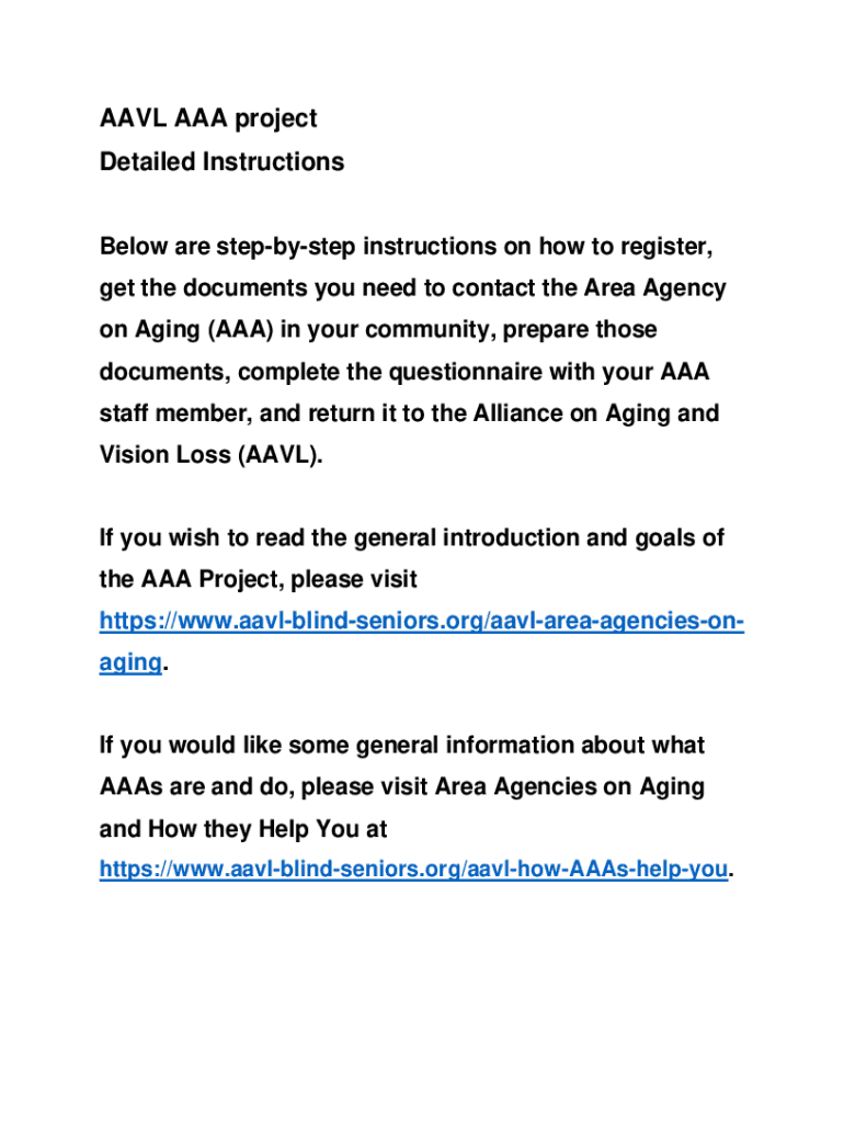 AAL AAA project Detailed Instructions Below are stepsister instructions on how to register, get the documents you need to contact the Area Agency on Aging (AAA) in your community, prepare those documents,