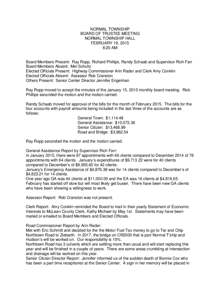 NORMAL TOWNSHIP BOARD OF TRUSTEE MEETING NORMAL TOWNSHIP HALL FEBRUARY 19, 2015 8:20 AM Board Members Present: Ray Rope, Richard Phillips, Randy Schwab and Supervisor Rich Far Board Members Absent: