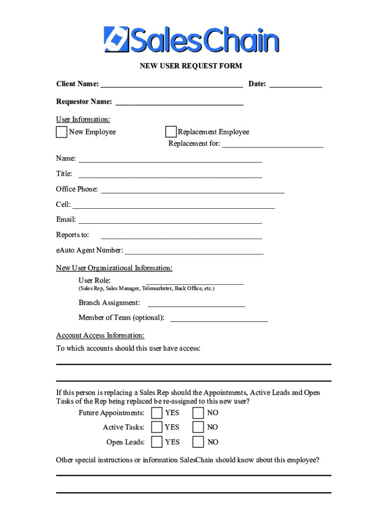 NEW USER REQUEST FORM Client Name: ___ Date: ___ Requestor Name: ___ User Information: New EmployeeReplacement Employee Replacement for: ___Name: ___ Title: ___ Office Phone: ___ Cell: ___ Email: