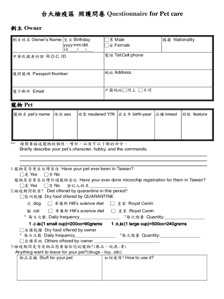 Questionnaire for Pet care Owner Owners Name Birthday YYY/mm/dd 19___/___/___ Male Female R.O.C. ID Tel/Cell phone Passport Number Address Email Nationality Pet pets name sex** neutered Y/N birth