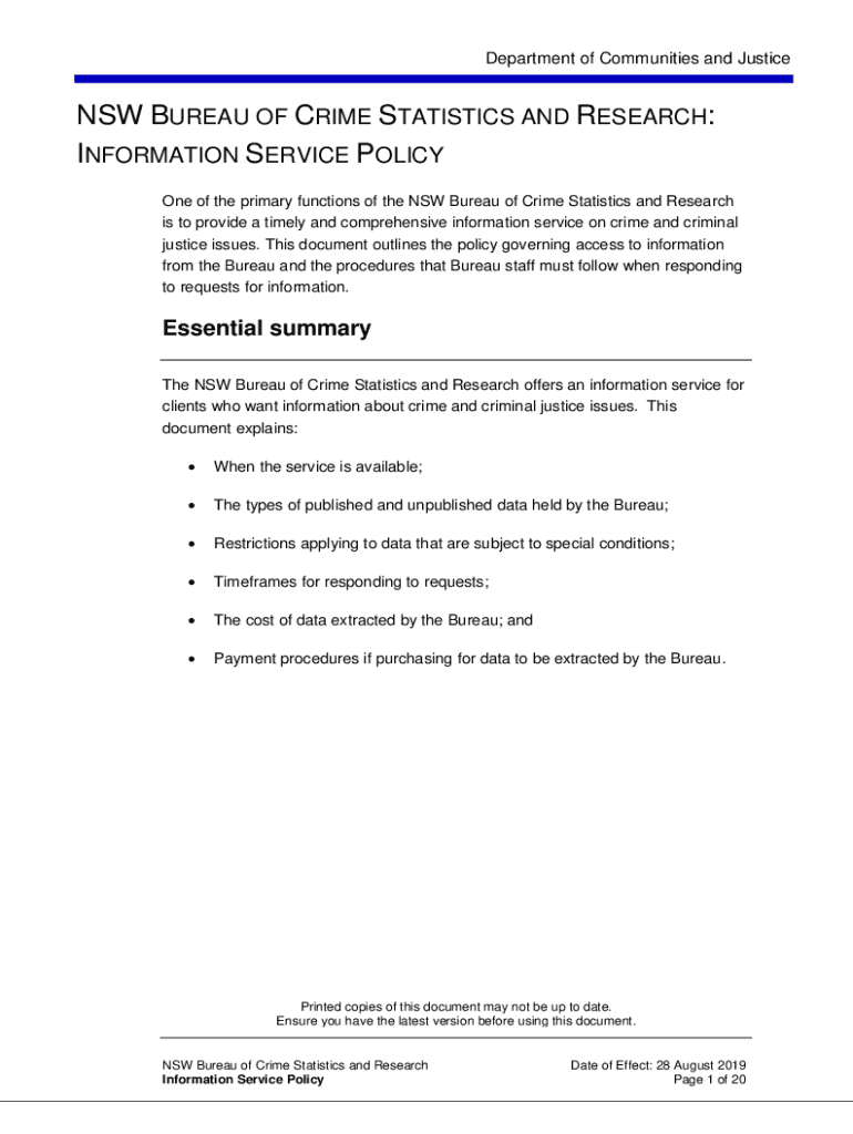 Department of Communities and Justice NSW BUREAU OF CRIME STATISTICS AND RESEARCH: INFORMATION SERVICE POLICY One of the primary functions of the NSW Bureau of Crime Statistics and Research is to