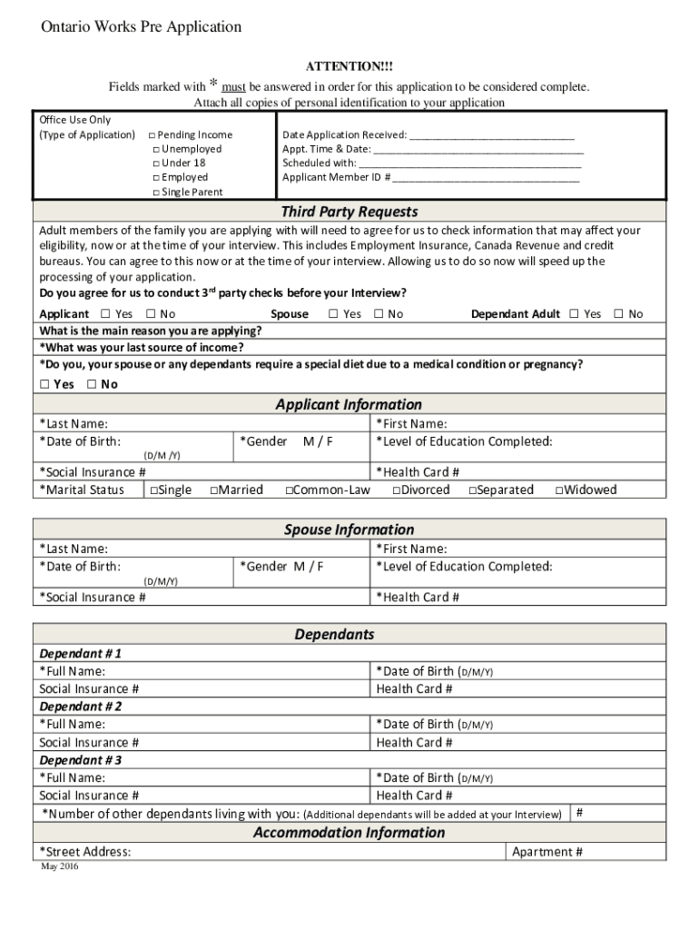 Ontario Works PRE Application ATTENTION!!! Fields marked with * must be answered in order for this application to be considered complete. Attach all copies of personal identification to your application