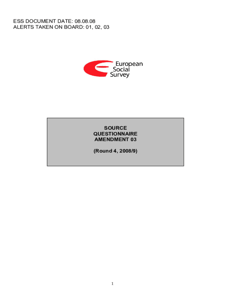 ESS DOCUMENT DATE: 08.08.08 ALERTS TAKEN ON BOARD: 01, 02, 03SOURCE QUESTIONNAIRE AMENDMENT 03 QUESTIONNAIRE CONTENTS(Round 4, 2008/9)1Q#TopicsCoreA1 A10Media; social trustCoreB1 B40Politics, including: