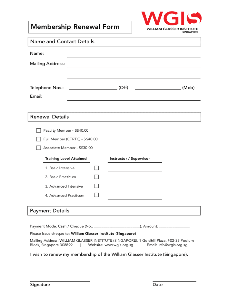 Membership Renewal Form Name and Contact Details Name: Mailing Address:Telephone Nos.:___ (Off)___ (Mob)Email:Renewal Details Faculty Member S$40.00 Full Member (CT RTC) S$40.00 Associate Member S$30.00