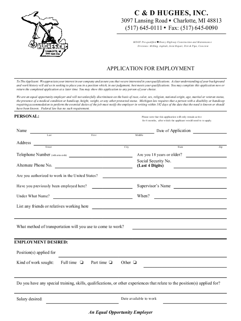 Get the free Application for employment - C & D Hughes, Inc.
