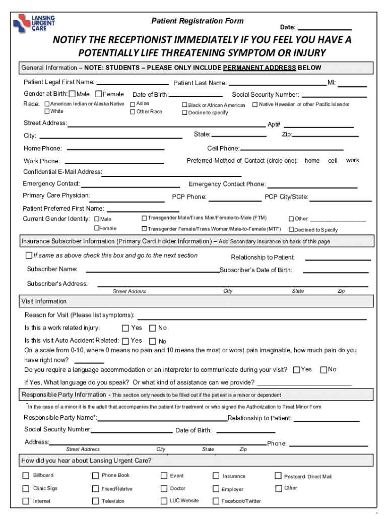 Patient Registration Format:NOTIFY THE RECEPTIONIST IMMEDIATELY IF YOU FEEL YOU HAVE A POTENTIALLY LIFE THREATENING SYMPTOM OR INJURY General Information NOTE: STUDENTS PLEASE ONLY INCLUDE PERMANENT
