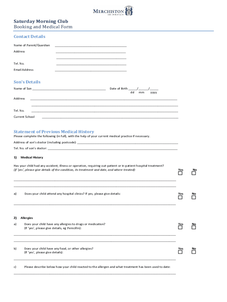 Saturday Morning Clubbing and Medical Recontact DetailsNameofParent/Guardian___Address______Tel. No. ___EmailAddress___Sons Details Jameson___ DateofBirth___/___/___ ddmmyyyy Address___ ___