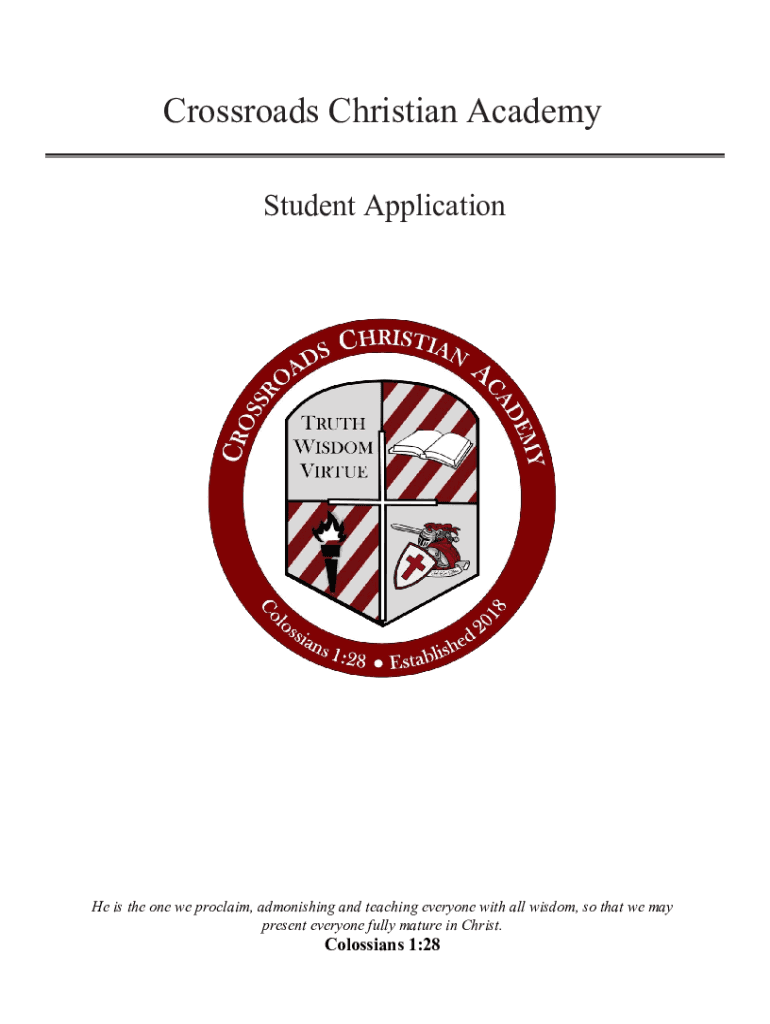 Crossroads Christian Academy Student Application He is the one we proclaim, admonishing and teaching everyone with all wisdom, so that we may present everyone fully mature in Christ. Colossians 1:28SA21Crossroads