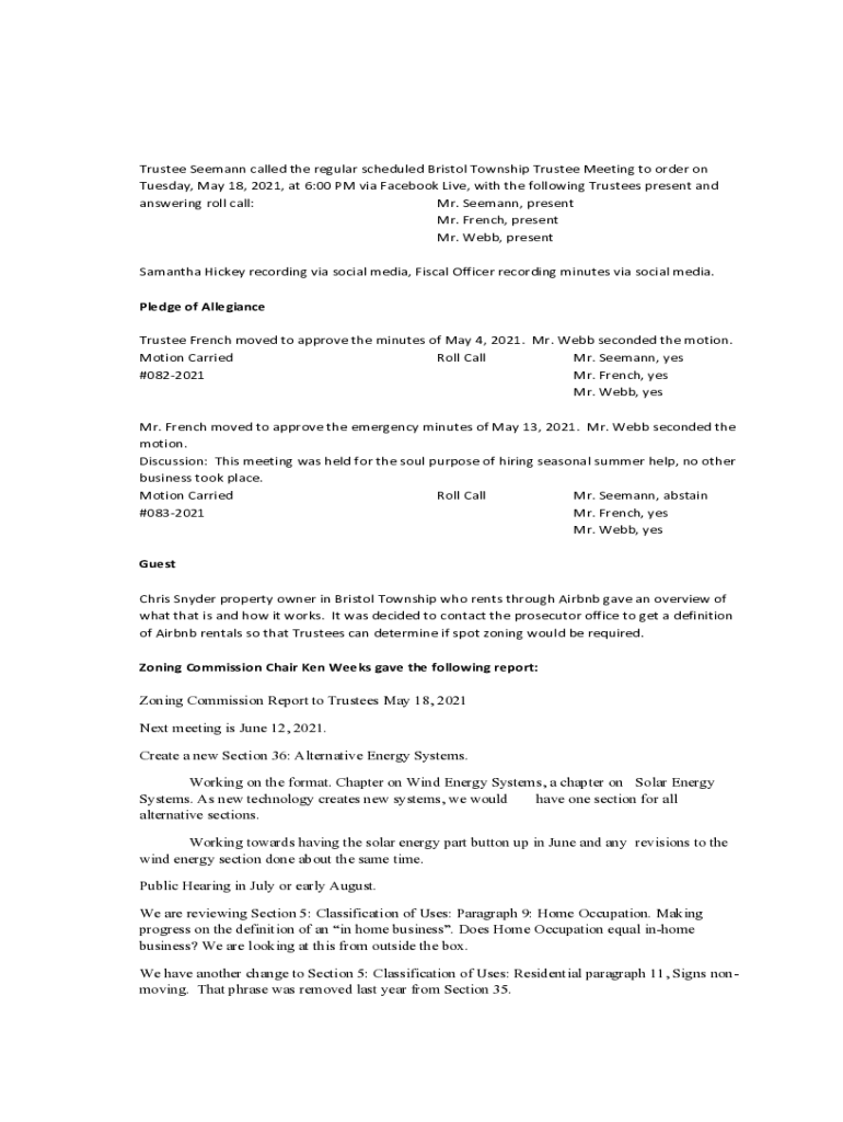 Trustee Seaman called the regular scheduled Bristol Township Trustee Meeting to order on Tuesday, May 18, 2021, at 6:00 PM via Facebook Live, with the following Trustees present and answering roll