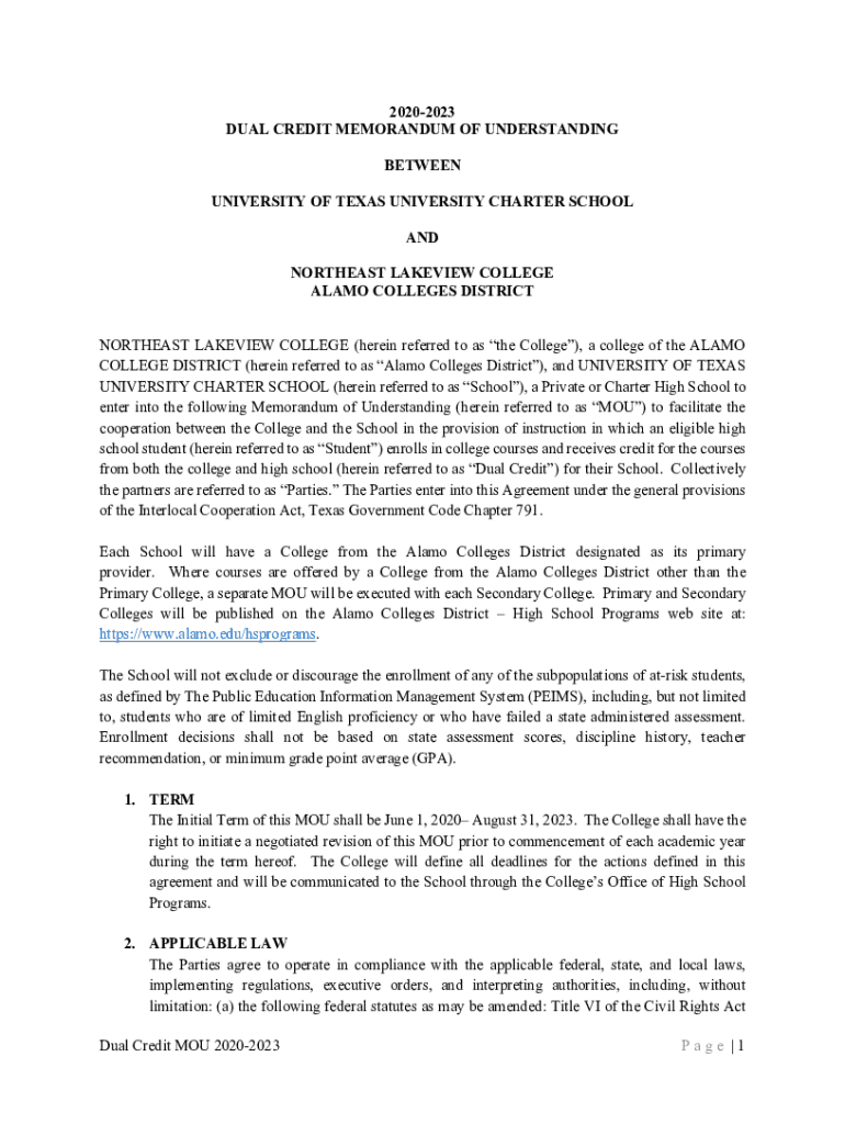 20202023 DUAL CREDIT Memoranda OF UNDERSTANDING BETWEEN UNIVERSITY OF TEXAS UNIVERSITY CHARTER SCHOOL AND NORTHEAST REVIEW COLLEGE ALAMO COLLEGES DISTRICT NORTHEAST REVIEW COLLEGE (herein referred