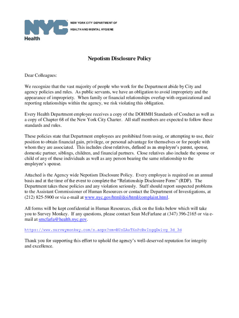 NEW YORK CITY DEPARTMENT OF HEALTH AND MENTAL HYGIENENepotism Disclosure Policy Dear Colleagues: We recognize that the vast majority of people who work for the Department abide by City and agency