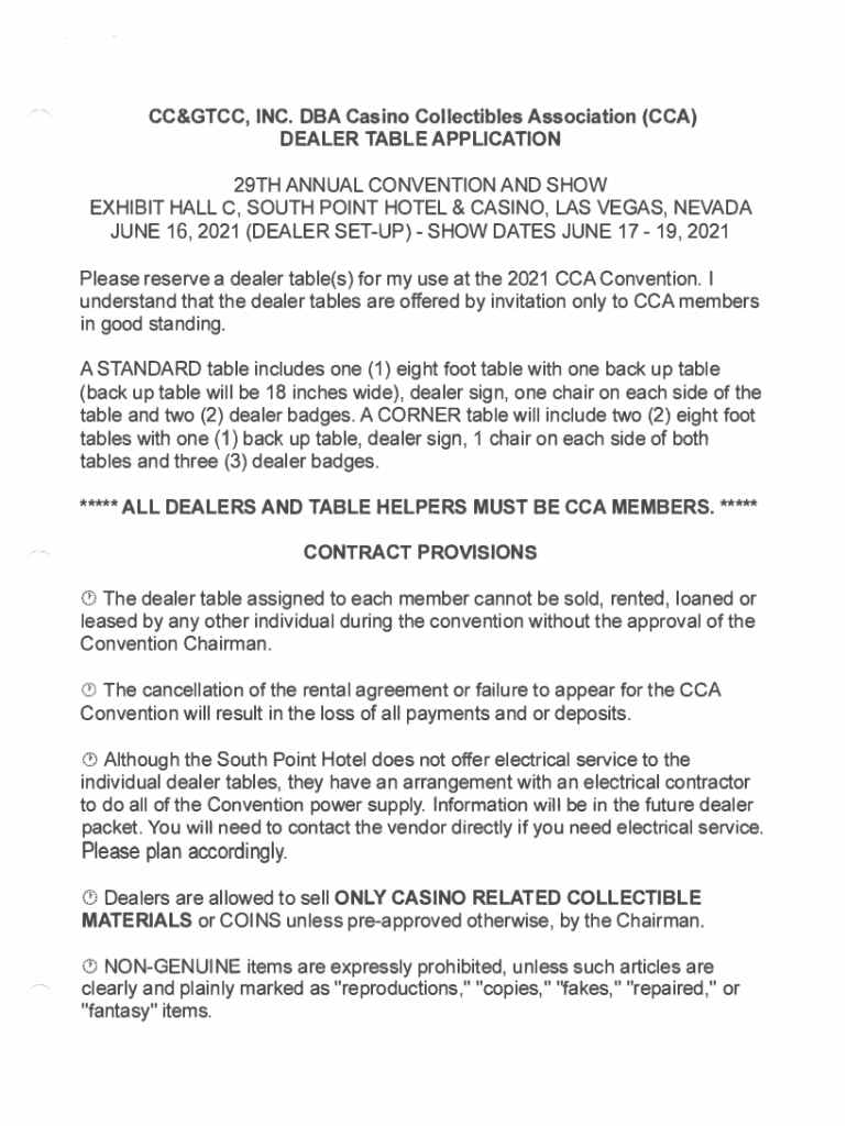 CCGC, INC. CBA Casino Collectibles Association (CCA) DEALER TABLE APPLICATION 29TH ANNUAL CONVENTION AND SHOW EXHIBIT HALL C, SOUTH POINT HOTEL & CASINO, LAS VEGAS, NEVADA JUNE 16, 2021 (DEALER SETUP)