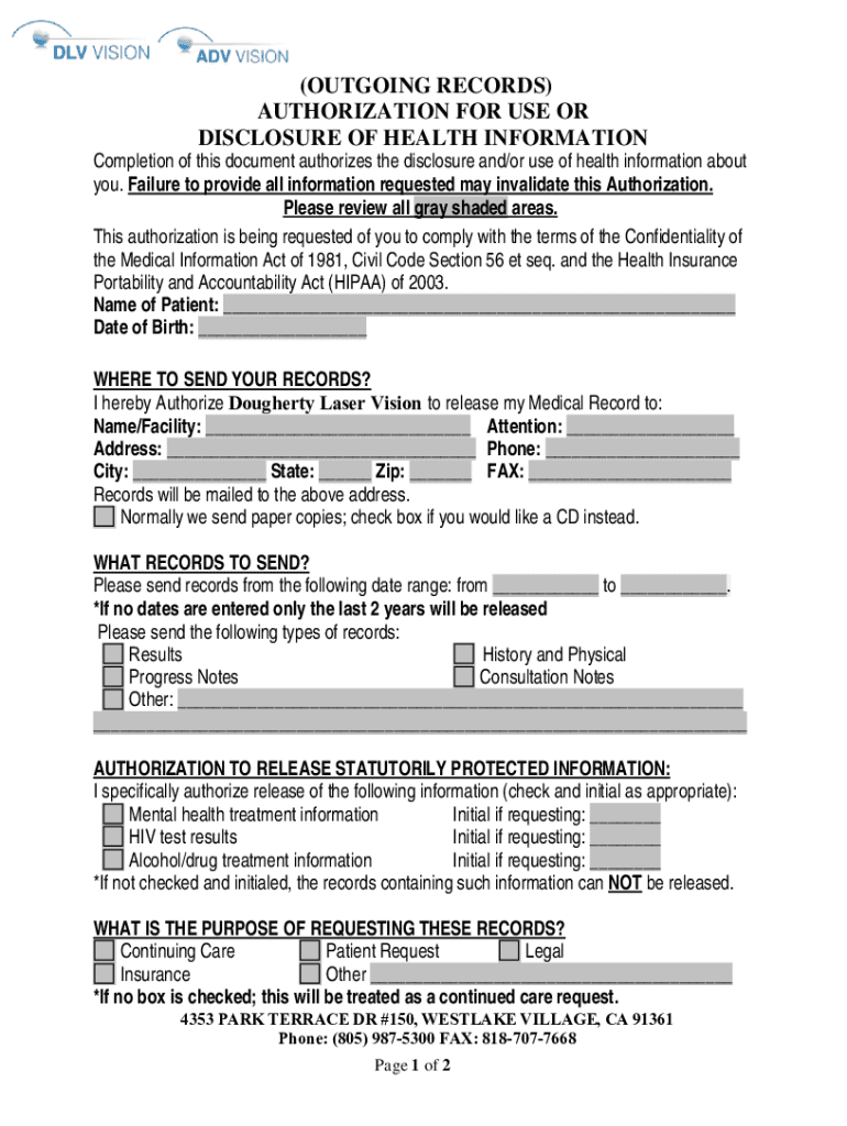(OUTGOING RECORDS) AUTHORIZATION FOR USE OR DISCLOSURE OF HEALTH INFORMATIONCompletion of this document authorizes the disclosure and/or use of health information about you. Failure to provide all